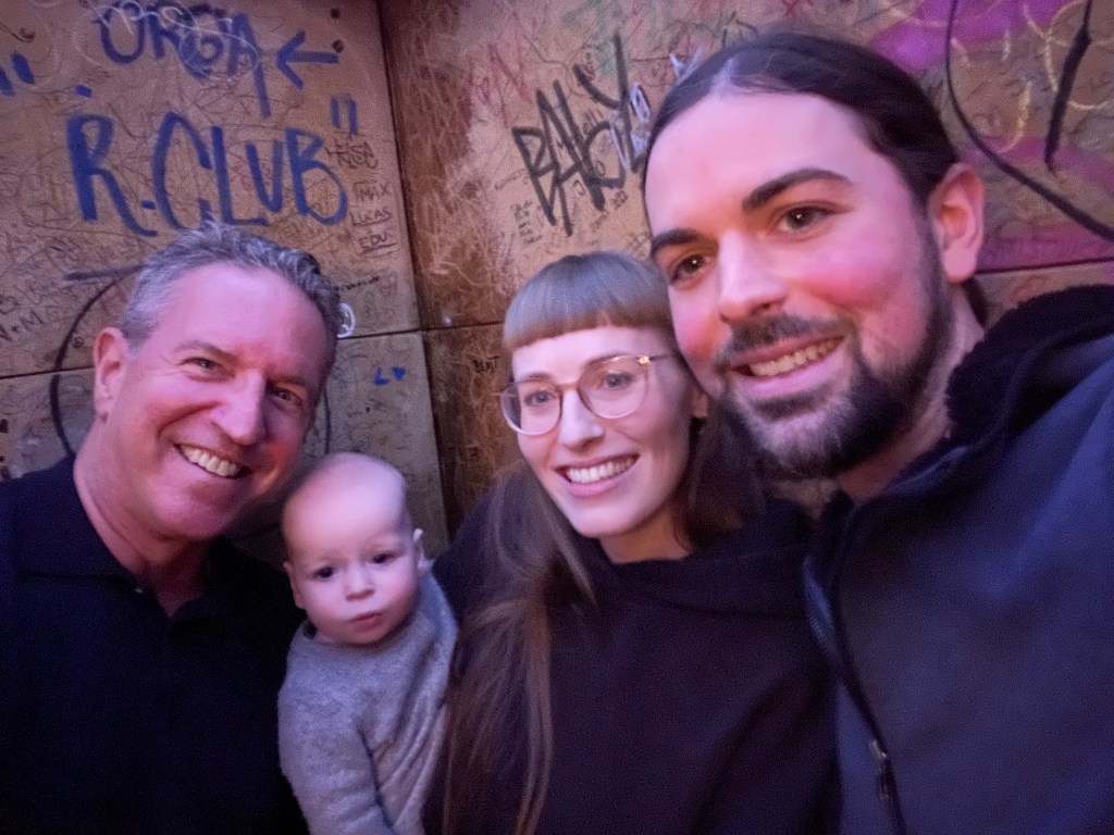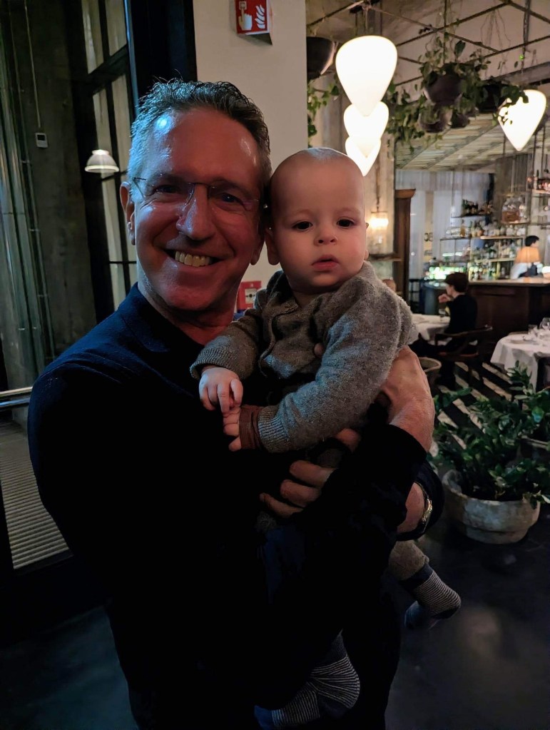 Back in 1984 I became a father and manager at CompuServe. Had no idea how to do either job. My first hire, was the dude on the left. His name? Doug Loewe. We would work together for twenty and we’ve been friends for almost forty. These two pics were taken by my son,Andrew, in Berlin. Doug held Andrew the same way 35 years ago.