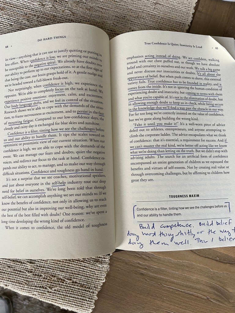 Pick a target. Reach. Fail. Learn. Reach again. Fail. Learn. Reach again. Achieve (build competence). Level up. Pick another target. Rinse and repeat. Kinda like happiness, confidence is a great outcome but a horrible aim. Build competence and confidence comes along for the ride. What’s a worthy target? LFG, friend.